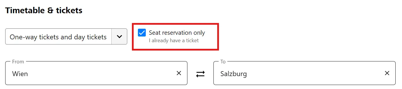 On the ÖBB website, to book a reservation, select the option:“Nur Sitzplatzreservierung - Ich habe schon ein Ticket”(“Seat reservation only - I already have a ticket”).