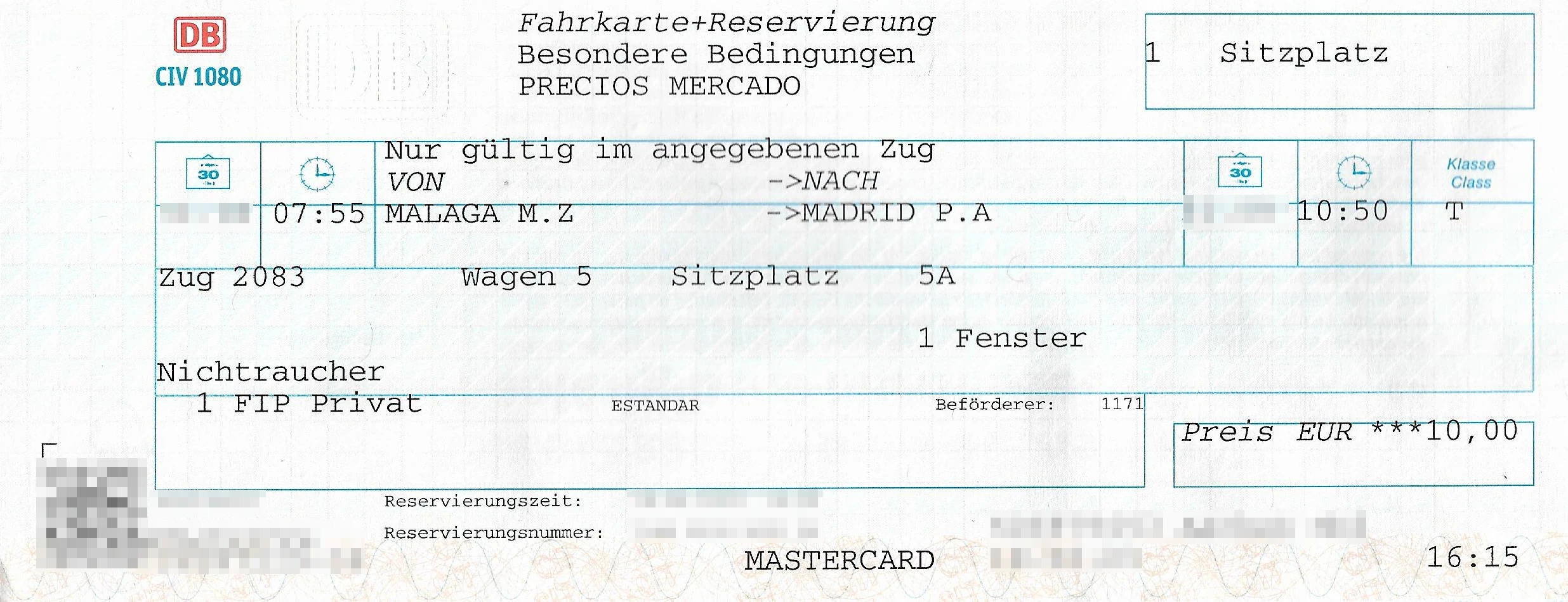 Tickets for trains requiring reservations can be sold at DB Reisezentrum (ticket office). Please ensure that either “T” (for Elige Estándar / Turista) or “P” (for Elige Confort) is specified as the class. If 1st class or 2nd class is selected as the class, tickets will not be issued with an error message. A booking of Premium class tickets is not possible through Deutsche Bahn’s sales channels. It has also been reported that the booking of class “P” sometimes fails, in which case a booking of class “T” often works. There is no booking fee.